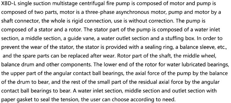 XBD-DL vertical single-stage single-suction fire pump for conveying solid particles in water and physical and chemical properties similar to water use , mainly for fire protection system piping pressurized water, also apply to industrial and urban drainage, high-rise building pressurized water , long-distance water , conditioning and refrigeration systems and equipment and other occasions