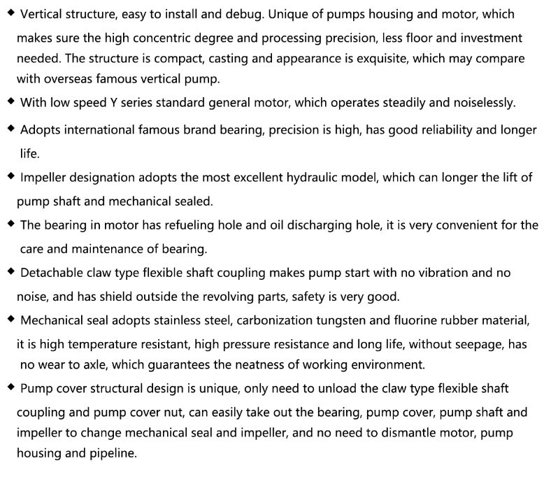 TLB type vertical pipeline centrifugal pump, is a kind of novel-structure and advanced-technology pump on the basis of TL type. Impeller and pump housing are designed with the most excellent hydraulic model, which eliminates vertical pump's big shaft force problem; motor is YE series standard general type, so it is convenient to change them
