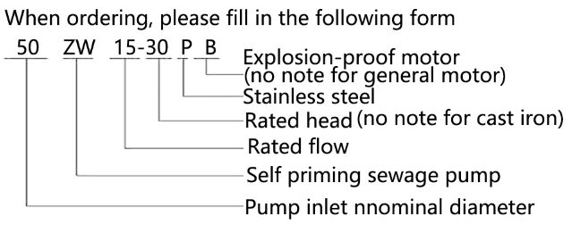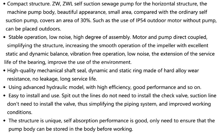 ZW Self-priming non-clogging sewage pump sets self-priming and non-clogging sewage in one, using axial reflux outer recirculation through the pump body, impeller passage of a unique design, without having to install bottom valve and irrigation water , the suction 60% and outlet diameter fiber length is five times the diameter of the outlet liquid containing large particles of solid impurities in diameter , and its self-priming height of 5 meters , can replace all types of diving , liquid-type sewage pumps.