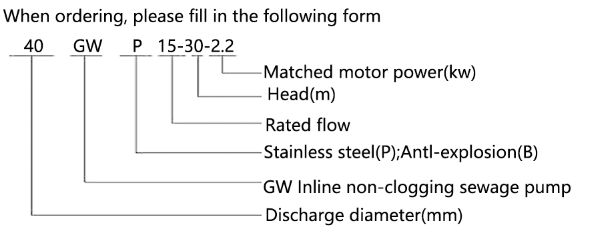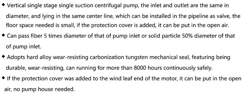 GW series non-clog single stage pipeline sewage pump, the inlet and outlet are on the same level, and the specification is the same, vertical structure, small space needed, motor and pump being coaxial, with chassis, install stably, the impeller has good ability of handling.