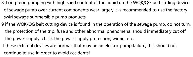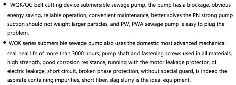 WQK (QG) belt cutting device submersible sewage pump with sewage through ability is specially strong, with cutting performance is good, the sewage in the long fiber, plastics, paper, and other impurities chopped after discharge, using the most advanced method, designed to be the most reasonable hydraulic characteristics, electric pump can lift operation, excellent dry motor and pump the best combination