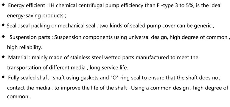 IH type chemical and industry pump is mono-grade mono-absorb cantilever type centrifugal pump, which is a kind of renew energy-saving product that replaced F type cauterization-resistant pump, it is suit to chemical and industry, petroleum, foodstuff, pharmacy and synthetic fiber and etc. department where transport the cauterization-resistant type medium or pgysical, chemical similar to water medium. This pump material is stainless steel.
