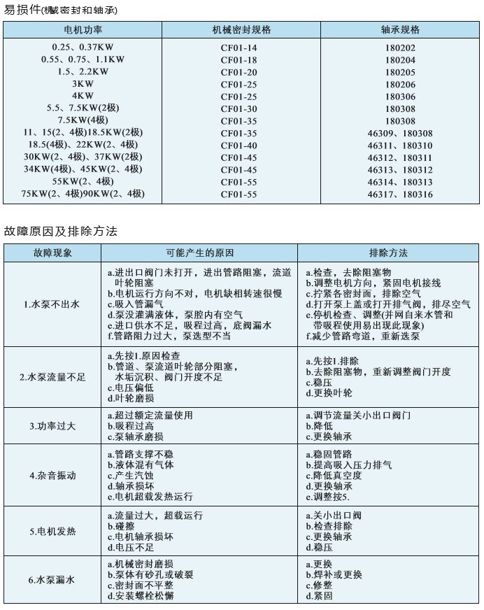 3、泵進行長期運行后,由于機械磨損,使機組噪音及振動增大時,應停車檢查,必要時可更換易損件,機組大修期一般為一年。